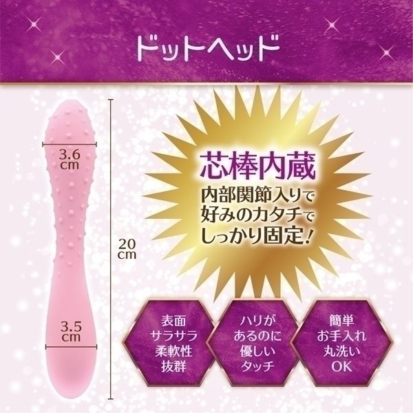 自分好みに調整できるフレキシブルなスティックタイプの商品です♪内部には関節構造が搭載されており、自由に曲げて形を調整することが可能!本体は全長20cmで、異なるサイズの2つのヘッドを採用しています♪3.6cmのヘッドには無数のドットが施されており、工夫されたデザインが楽しさを引き立てます!曲げた形をそのままキープできる構造なので、さまざまなシーンでお使いいただけます♪使用後は水で丸洗いし、しっかり乾燥させてから保管してください!高品質なシリコン素材で耐久性に優れ、使いやすさも抜群♪ぜひ、この多機能なアイテムで新しい体験をお楽しみください! |