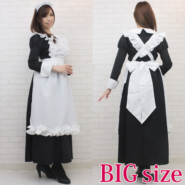 | ■仕様:BIGサイズ:B92〜103cm・W70〜90cm 丈:ワンピース130cm(肩幅40cm、袖丈57cm)、エプロン115cm セット内容:ワンピース(首周りホック有り、後ろファスナー)・エプロン(2段階長さ調節ボタンあり)・カチューシャ |