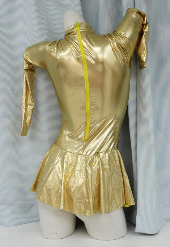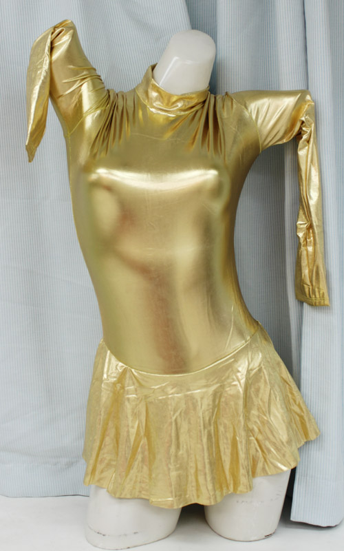 まるでフィギュアスケーターのような、スカート付きの長袖レオタード。 エナメル製のように光沢のある、キラリと輝くゴージャスなゴールドカラー!伸縮性があるので、ピッチリとしたバストやクビレが美しいボディラインを引き立てます!ひらりと軽いスカートから覗く、ハイレグとヒップラインがとってもセクシーなコスチューム!背中のファスナーで脱着衣が可能です。 ※水洗い可、塩素系漂白剤による漂白不可、ドライクリーニング可、色落ちの可能性があります。 ※こちらの商品は在庫の状況によりお届けまでに4日〜7日程度かかる場合がございます。 |