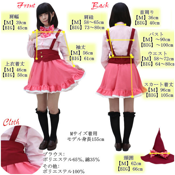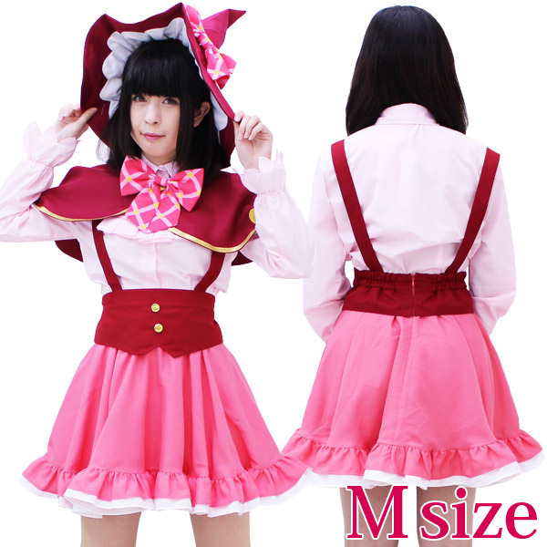 | ■仕様:Mサイズ:B〜90cm・W58〜72cm ブラウス(肩幅39cm、袖丈57〜60cm、着丈58cm、首回り36cm) スカート(丈46cm、肩紐58〜65cm) 帽子:頭囲62cm セット内容:ブラウス(前ボタン・袖口ゴム)、フリルタイ、リボン、肩紐付きスカート、ケープ(前スナップボタン留め)、リボン付き帽子(リボン固定用のスナップボタン付) |