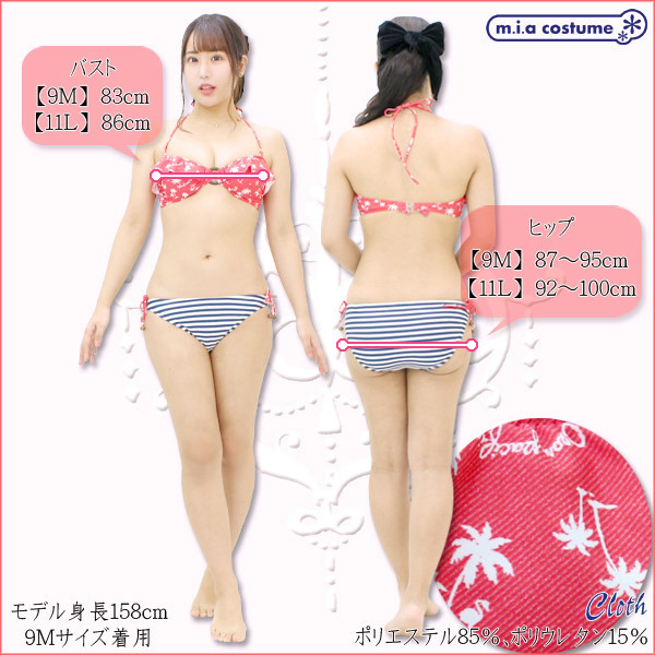 | ■仕様:9Mサイズ:B83cm・H87〜95cm セット内容:トップス(パッド着脱可、ワイヤー無し)、ビキニショーツ 素材:ポリエステル85%、ポリウレタン15% 生産国:日本 |
