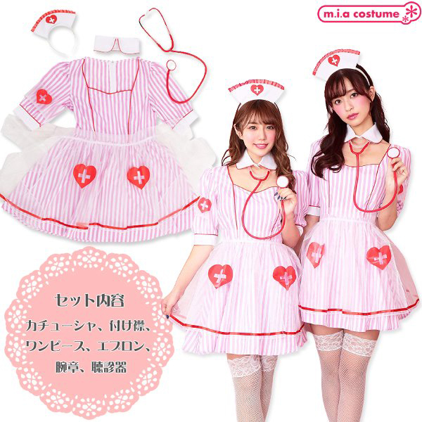 ハロウィン用のコスチュームとしてだけではなく、仮装コスプレとしてもどうぞ♪ストライプ生地に、オーガンジーの透けた紋章とエプロンがかわいいナースコスチュームです。 聴診器も付いていて充実の6点セットが嬉しい♪付け襟と開いた胸元が魅力的でポップな配色がフォトジェニックです。 カラバリもあるので双子コーデにもおすすめ!変装用としてだけではなく、雰囲気を盛り上げたいときにもどうぞ♪ ※洗濯不可、塩素系漂白剤による漂白不可、アイロンは中温で当て布使用(プリント部分のアイロンはお避け下さい)、ドライクリーニング不可 |