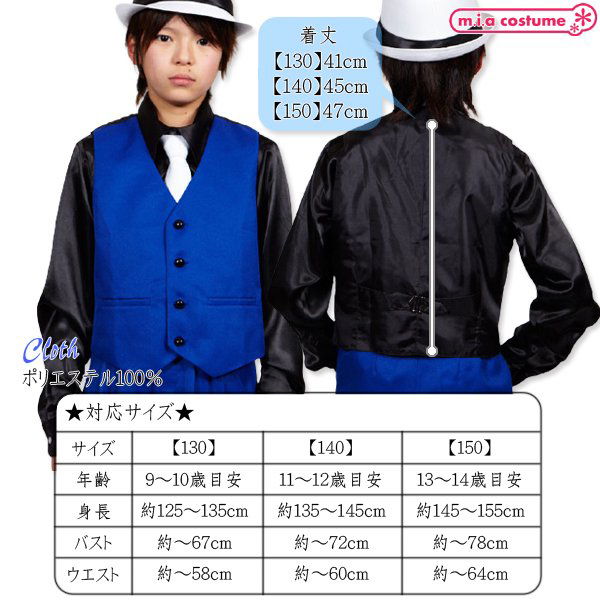 | ■仕様:130サイズ 対応サイズ:身長125〜135cm・B〜67cm・W〜58cm 実寸:着丈41cm セット内容:ベスト単品(前ボタン) 素材:ポリエステル100% |