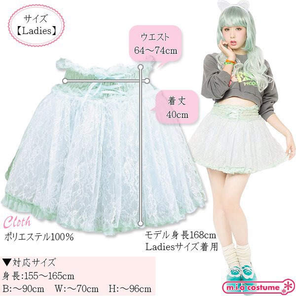 | ■仕様:対応サイズ:身長155〜165cm・B〜90cm・W〜70cm・H〜96cm 実寸:W64〜74cm・着丈40cm セット内容:スカート単品(ウエストゴム) 素材:ポリエステル100% モデル身長168cm |