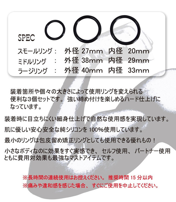 3種類のリング入り!勃起力・持続力・矯正効果が期待できる男のためのシリコン製パワーリング(ホワイト)。 ●ペニスリング3個セット(ソフトタイプ)●純シリコン100%使用●スモール:外径27mm・内径20mm●ミドル:外径38mm・内径29mm●ラージ:外径40mm・内径33mm●装着感を与えない細身仕上げ●スモールリングは包皮留め矯正リングとしても◎●推奨使用時間15分以内。 個人差はあるものの、装着するだけで絶大な効果が期待できる男性補助グッズです。 ※痛みや違和感を感じた場合、すぐにご使用を中止してください。 |