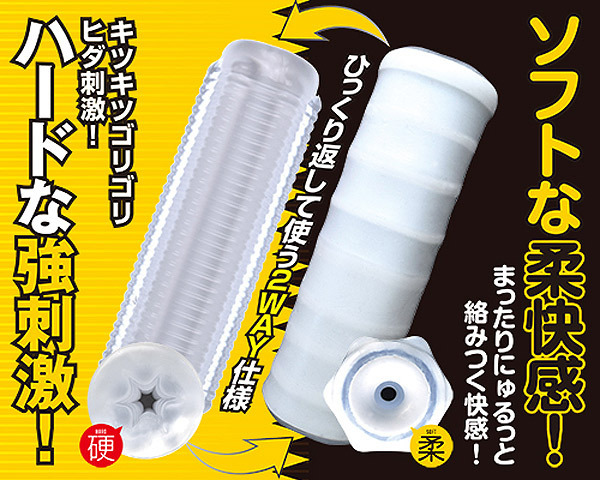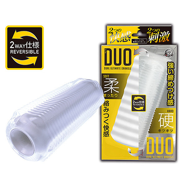 ソフトとハードの刺激をこれ一つで♪ひっくり返して使う両面仕様のリバーシブルオナホール「DUO(デュオ)」。 ●裏返して使うリバーシブルタイプ●ハード:クリア素材の細ヒダ構造●キツキツなゴリヒダの強刺激快感●ソフト:ふわふわ白素材の柔構造●にゅるっとまったり絡みつく快感●裏返しやすく洗浄しやすい貫通型。 気分に合わせて使い分け♪表と裏で異なる挿入感を楽しめる2WAY仕様のオナホール。 にゅるっと絡みつくソフトな快感と、ゴリヒダ刺激のハードな快感をお楽しみ下さい。 |