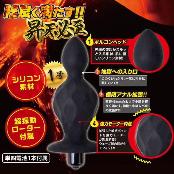 昇天必至の超強力ローター搭載!強烈な刺激が癖になる電動アナルプラグ「ボルコン1号」。 二段の膨らみを持つくびれボディはシリコン素材で滑らかな肌触り!表面にはウェーブ筋を入れて刺激をプラス。 スルッと入る先端ボルコンヘッドの先にあるくびれを超えると、二つ目の大きな膨らみが腸内を程よく満たします。 さらに、拡張した敏感ポイントに強力振動ローターが刺激を与える悶絶必至のアナル拡張グッズ。 初級〜中級者向けサイズの1号は全長11cm、最大径はシリーズ最小でも4.5cmとやや大きめです。 単四電池×1本付属。 |