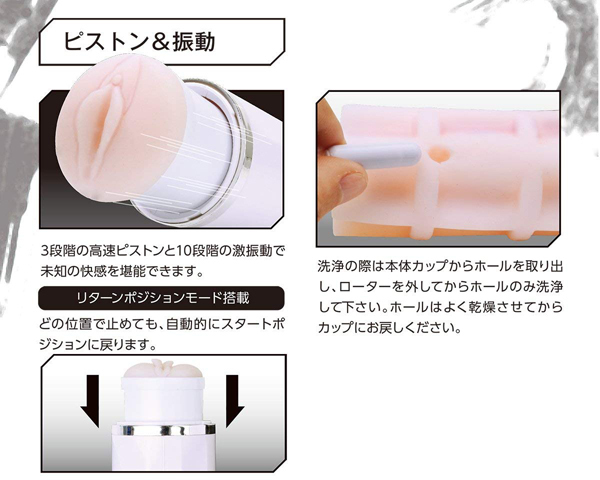 握力いらずで快感に集中できる、驚異のハイパワーを実現したピストンオナホ!ダブルの刺激とハイパワーが自慢のピストンモードを搭載したカップ型の電動オナホは他に類を見ません♪3段階の高速ピストンと10段階もの激振動で、これまでにない未知の快感を体感できます!本体上部の空洞部分には親指を通して固定できるので、握力をさほど使わずに使用可能。 付属のホールはリアルな形状で、挿入口付近はヒダとイボのジョリジョリが貴男の息子を優しく刺激♪縦ヒダと横ヒダの肉塊とねっとり絡みつく快感、突く度に先端を襲うイボによるコリコリ刺激がたまりません!ご使用後はホールを取り外して洗浄可能♪電源はUSB充電式で、4時間の充電で約40分の連続使用が可能です。 |
