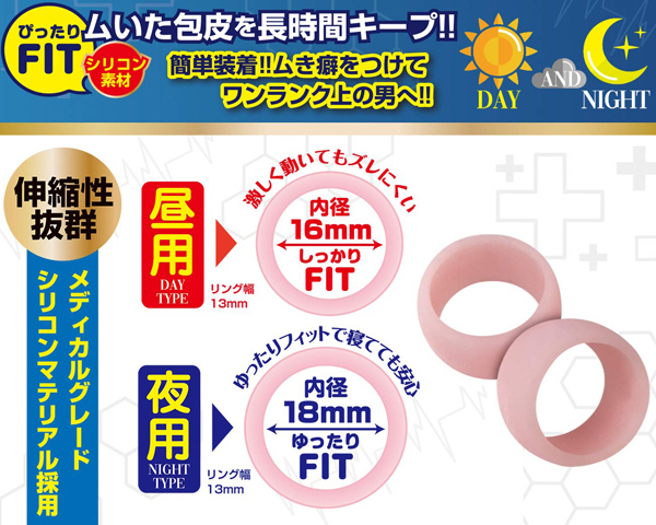 | ■仕様:パッケージ:13.0×8.1×2.2cm 本体:昼用(内径1.6cm、リング幅1.3cm)・夜用(内径1.8cm、リング幅1.3cm) |