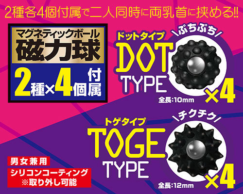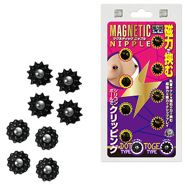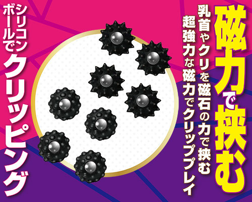 マグネットの強力な磁力で敏感な部分を挟みこむ男女兼用のニップルグッズ2種セット。 ボディピアスのように穴は開けず、超強力な磁力を使って乳首やクリをクリップ刺激!素材は肌に優しいシリコン製で傷つけにくい♪無数の球体が付いた全長10mmのドットタイプ4個、まきびしのようにトゲトゲとした全長12mmのトゲタイプ4個付属 |