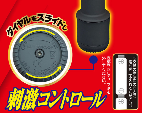 くの字に曲がった幅3.5cmの丸い先端形状でGスポを的確に捉え徹底的に刺激、中を圧迫しながら強烈振動を加えれば大量潮吹きまで一直線!ダイヤルを回すだけの無段階調整式で初心者でも簡単♪挿入部18cm、滑らかマット加工を施した電池式バイブ。 丸洗い可能な生活防水仕様◎単三電池を2本使用、ブラック |