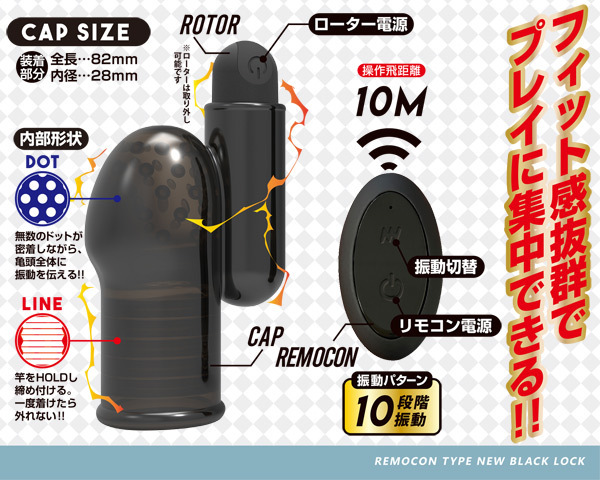 爆発的人気の亀頭責めローター「ブラックロック」シリーズ最新作!小型リモコンによる遠隔操作でハンズフリーで楽しめるUSB充電式ローター。 フィット感抜群のキャップ内には密着感を高めるドットと横溝を配置!サオをギュッと締め付けながら亀頭を細かに刺激する!振動は10段階搭載、操作飛距離は10mまで対応。 防水式でお手入れ簡単。 |