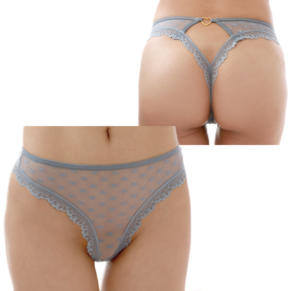 ラブリーなハート模様を控えめに魅せるデザインがポイント!グレー系のカラーメッシュ素材の透け見える感じで大人っぽさもあるTバックショーツ。 ベースとなるメッシュ生地には小さなハート柄が入っていて、トリミングのレース使いや、深めのレッグカットが美脚なシルエットも演出してくれるショーツです♪フロントはやや大人しめなデザインですが、バックにはダイヤ型のカットアウトが入っており、トップにはゴールドのハートモチーフがアクセッぽくキラリと輝いて視線を惹きつけます! ※刺繍などのデザインが異なる場合がございます。 濡れたままの保管は色移りの原因になります。 |