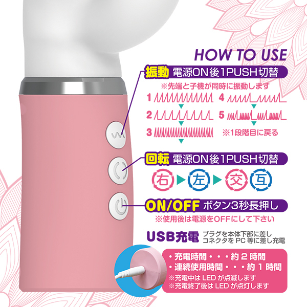 | ■仕様:パッケージ:25.5×9.3×4.7cm 本体:全長22.5cm・挿入部11.0×3.8cm 材質:ABS、TPE 重量:270g USB充電式 |