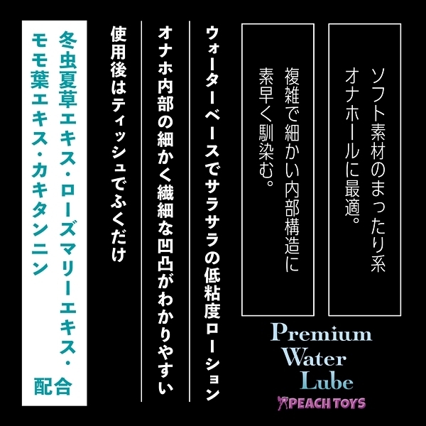『水のように滑らか、でもヌルヌル感持続!ふき取るだけでOK!』「ふくだけローションPremium Water Lube (180ml)」が、ラベルデザインと容量・成分をリニューアルして再登場です!黒いポンプの「ふくだけPWL」は、【低粘度+シャバシャバ系】ソフト素材のまったり系オナホールに最適。 複雑で細かい内部構造に素早く馴染む。 冬虫夏草エキス・ローズマリーエキス・モモ葉エキス・カキタンニン配合●ウォーターベースでサラサラの超低粘度ローション●オナホ内部の細かく繊細な凹凸がわかりやすい●使用後はティッシュでふくだけ簡単●無香料●安心の日本製●500ml スタンダード <成分>水、プロパンジオール、ヒドロキシエチルセルロース、乳酸、キサンタンガム、ローヤルゼリーエキス、アルギニン、マカエキス、水溶性コラーゲン、グリチルリチン酸2K、ローズマリーエキス、モモ葉エキス、カキタンニン、銀、フユムシナツクサタケエキス、クエン酸、クエン酸Na、BG、エタノール、セルロースガム、炭酸水素Na、フェノキシエタノール、EDTA-2Na、ブチルカルバミン酸ヨウ化プロピニル |