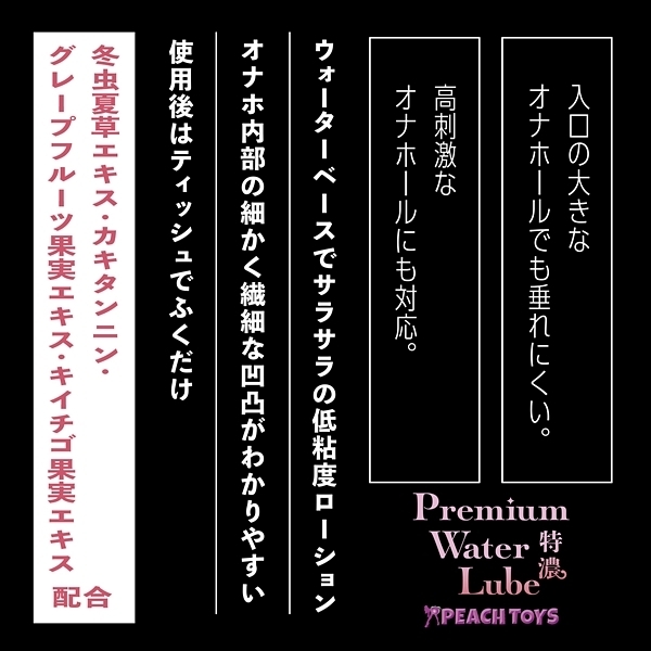 『水のように滑らか、でもヌルヌル感持続!ふき取るだけでOK!』「ふくだけローションPremium Water Lube (180ml)」が、ラベルデザインと容量・成分をリニューアルして再登場です!白いポンプの「ふくだけPWL 特濃」は、【低粘度+濃厚な液体】入口の大きなオナホールでも垂れにくい。 高刺激なオナホールにも対応。 冬虫夏草エキス・カキタンニン・グレープフルーツ果実エキス・キイチゴ果実エキス配合●ウォーターベースでサラサラの超低粘度ローション●オナホ内部の細かく繊細な凹凸がわかりやすい●使用後はティッシュでふくだけ簡単●無香料●安心の日本製●500ml 特濃 <成分>水、プロパンジオール、ヒドロキシエチルセルロース、乳酸、キサンタンガム、ローヤルゼリーエキス、アルギニン、マカエキス、水溶性コラーゲン、グリチルリチン酸2K、ローズマリーエキス、モモ葉エキス、カキタンニン、銀、フユムシナツクサタケエキス、クエン酸、クエン酸Na、BG、エタノール、セルロースガム、炭酸水素Na、フェノキシエタノール、EDTA-2Na、ブチルカルバミン酸ヨウ化プロピニル |
