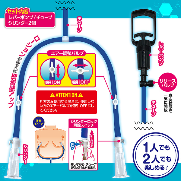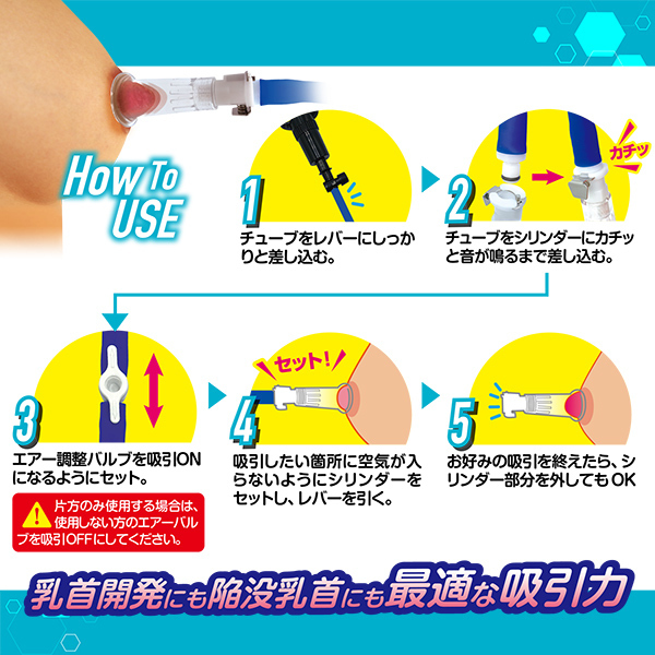 超強力吸引!1人でも2人でも楽しめる!!同時に乳首をW責め!!!シリンダーの径が小さいからピンポイントに超強力吸引!!!1個だけの吸引も可能。 両乳首・片乳首、クリだけなど…ローションを使用して密着感UP。 アイデア次第で感じる乳首開発を♪エアー調整バルブで微調整が可能なので、自分に合った吸引具合で楽しもう♪ |