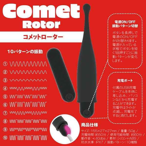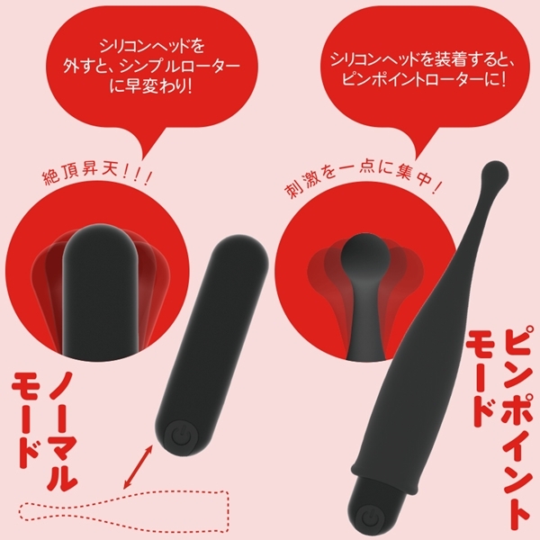 初心者でも扱いやすいピンポイントローターです♪ヘッド部分には肌触りの良いシリコン素材を使用し、小型ながらもパワフルな刺激をお届けします!狙ったポイントを的確に刺激できるピンポイントモードと、シリコンヘッドを外して使用するノーマルモードの2WAY仕様♪ワンボタンで簡単に操作でき、10種類の振動パターンからお好みの刺激を選べます!IPX7等級の完全防水なので、お風呂などでも使用可能です♪ |