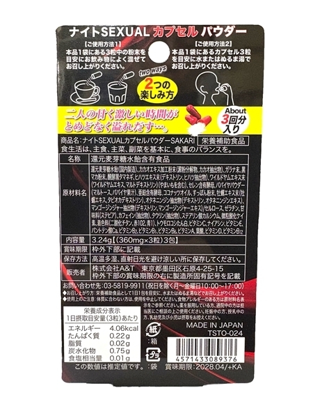 厳選された16種類の成分を独自配合したカプセルタイプのパウダーです♪黒マカ粉末、ガラナ末、スッポン末、高麗人参エキスパウダーなど、こだわりの成分があなたの活力をサポートします!カプセルはそのまま飲んでも、パウダーを飲み物に混ぜても楽しめる設計です♪粉末は自然な甘みで、様々な飲み物に溶けやすく着色しにくいのも魅力!持ち運びに便利なパウチタイプで、外出先でも気軽に使えます♪安心の日本製カプセルで、品質管理も徹底しています!あなたの毎日にプラスのサポートを、ぜひお試しください♪ |
