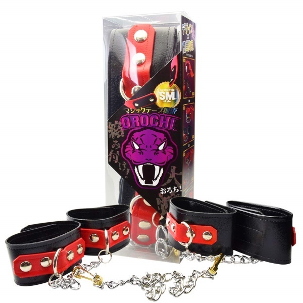 肌触り・質感、触れば分かる素材に拘った日本製本格SM拘束具シリーズOROCHI。 質感が違うからよりリアリティのあるSMプレイが楽しめる♪雰囲気を盛り上げる高級感のある設えが感情を刺激する!両手両足の自由を抑制された上に、さらにジョイント拘束チェーンで自在に変態プレイが楽しめる! お手軽なマジックテープ拘束。 カラー:ブラック |