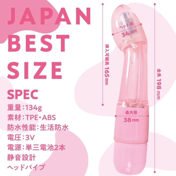 | ■仕様:パッケージ:22.9×6.8×4.5cm 本体:全長19.8cm・挿入可能長16.5cm・ヘッド径3.4cm・最大径3.8cm 重量:134g 電池:単三電池×2本使用 |