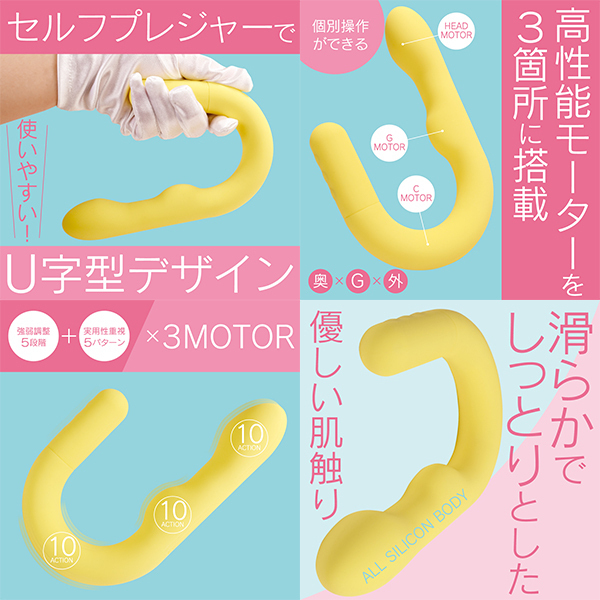 セルフケアをもっと自由に楽しめるU字型バイブレーターです♪ヘッド・Gポイント・外側刺激用の3箇所に、それぞれ独立したモーターを搭載!お好みに合わせて個別に振動を調整できるので、自分だけのリズムを作り出せます♪振動は5段階の強弱調整と5種類の多彩なパターンを組み合わせた、合計10種類を搭載!押し当てて楽しむ独特な形状が、自由な使い方をサポートします♪高性能モーターと高品質な素材を組み合わせた、安心のジャパンクオリティ!オールシリコンボディのしっとりとしたやさしい肌ざわりで、ストレスフリーな使用感を実現しました♪約120分の充電で、最大約60分の連続使用が可能!(使用環境により変動します!)IPX6対応の防水仕様で、清潔に保ちながら長くご使用いただけます♪ |