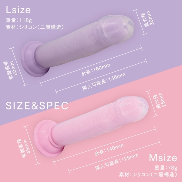芯のある構造とぷにっと柔らかい外層が魅力のディルドアイテムです♪全長約14cm、挿入可能長は約12.5cmと程よいサイズ感で、扱いやすさも抜群です!内部は硬めの芯素材で安定感があり、外側は柔らかく肉感のある素材を採用しています♪中外ともに高品質なシリコンを使用し、安全性とリアルな質感を追求しています!吸盤付きなので壁や床にしっかり固定でき、両手を自由に使えるのも嬉しいポイントです♪ズレにくく、好みの角度で安心して使用できます!見た目はクリア×パープルのカラーリングで、可愛さと大人っぽさを両立したデザインです♪リアルな形状と素材感で、満足度の高い使用感を提供します!初めての方にもおすすめできる、実用性とビジュアルを兼ね備えたモデルです♪毎日のセルフケアをちょっと楽しくしてくれる一本です! |