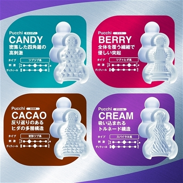 プラスウェッチは独自開発の新素材。 水をつけて軽く擦ることで内部の超ミクロサイズで閉じ込められた「潤いゼリー」が水に反応し、沁みだし樹脂表面をねっとりと潤い包みこみます。 <デコボコ感さらにクッキリ。 >「HD(High Definition)成形」で突起のデコボコ感がさらにクッキリになりました。 突起に触れたときの粒立ちが違います。 <キャンディー内部構造>「密集した四角錐の高刺激」整然と敷き詰められた四角錘の突起<クリーム内部構造>「吸い込まれるトルネード構造」斜めに擦り上げてくるヒダはクリームのように昇りつめる絶頂感<ベリー内部構造>「全体を覆う繊細で優しい突起」フワフワとした起毛が包み込みまったりしたなめらかな触感<カカオ内部構造>「反り返りのあるヒダの多層構造」ビッシリ並んだヒダは反発しながら複雑に絡みつく刺激 |