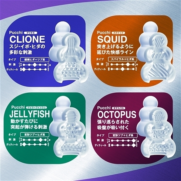 プラスウェッチは独自開発の新素材。 水をつけて軽く擦ることで内部の超ミクロサイズで閉じ込められた「潤いゼリー」が水に反応し、沁みだし樹脂表面をねっとりと潤い包みこみます。 <デコボコ感さらにクッキリ。 >「HD(High Definition)成形」で突起のデコボコ感がさらにクッキリになりました。 突起に触れたときの粒立ちが違います。 <クリオネ内部構造>「スジ・イボ・ヒダの多彩な刺激」大ぶりの突起たちが全体を大胆に刺激する<ジェリーフィッシュ内部構造>「動かすたびに突起が弾ける刺激」長めに作られた突起が全体を弾いて刺激する<オクトパス内部構造>「張り巡らされた吸盤が吸い付く」吸盤とイボが密着し触感を生み出す<スクイッド内部構造>「突き上げるように延びた触感ライン」大きく隆起をしたスリットが奥へ奥へといざなう |