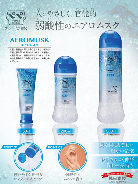 人肌と同じ弱酸性なのでお肌に敏感な人でも安心して使える「ペペスペシャル エアロムスク (200ml)」。 ほんのりと優しく香るムスクの香りが官能的で、しっかりとした粘度と相まってエッチな気分を盛り上げます♪ローションには細かな気泡が入っていて軽いテクスチャーと滑りが心地よく、便利なワンタッチキャップを採用しているので使いやすさも抜群です!気分を盛り上げたいときにもどうぞ。 |