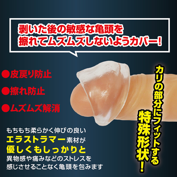 こちらのリングは皮を引っ張り装着することで戻りを抑えるだけでなく、剥いた後の敏感な部分が、パンツやズボンで擦れて気持ち悪くならないようにしっかりカバー。 自然に乾燥されることで、あの剥いた後のムズムズ感を解消。 素材もエラストマーなので、柔らかくしっかり伸びてフィットします。 |