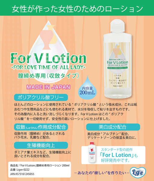 バラ花水、乳酸、アルブチン(美白成分)、ダミアナ葉エキスなど美白効果が期待できそうな良成分がしっかり入った「For V Lotion 200ml」。 女性が作った女性のためのローションで、美白ケアやスペシャルな女性を目指したいときに♪ |