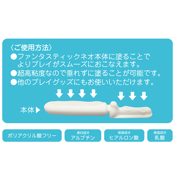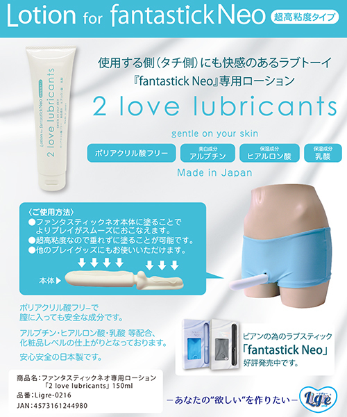 レズビアン専用の超高粘度タイプのローション「2 love lubricants 150ml」です。 あの人気商品「ファンタスティックネオ専用ローションで、膣に入っても安全な化粧品レベルの安全性が特徴!チューブタイプなので適量を取り出しやすく、美白成分アルブチン、保湿成分ヒアルロン酸、乳酸が入った化粧品レベルの仕上がりとなっております♪歯磨き粉のような硬さ超高粘度!スティックに垂れる事なく塗る事ができて使いやすい♪ファンタスティックネオだけじゃなくバイブやローターなど他のグッズにもお使いいただけます。 |