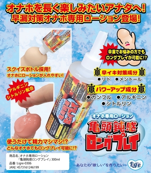 じっくり楽しみたい方のために開発された専用ローションです♪メントールやカンフルなどの成分を配合し、ひんやりとした使い心地を演出します!アルギニンやシトルリンなどのサポート成分も加え、快適な使用感を追求しました♪粘度はほどよく、さまざまなタイプのオナホールと相性よく使える水溶性タイプです!スクイーズ式ボトルを採用しているため、使いたい分だけを片手で簡単に注ぐことができます♪扱いやすく、清潔に使用できる点も嬉しいポイント!持久力に不安がある方や、プレイ時間を長く楽しみたい方にもおすすめです♪毎日のセルフケアをもっと快適に、もっと自分らしく楽しみたい方にぴったりの一本!シンプルなボトルデザインで保管や持ち運びにも便利です♪充実したひとときのために、ぜひご活用ください! |