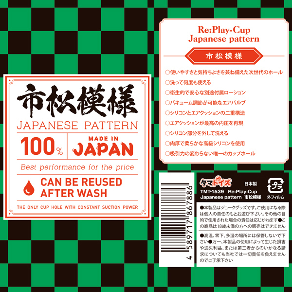 話題性のある「柄」をモチーフにしたパッケージデザイン!使い勝手と気持ちよさを兼ね備えたリプレイカップジャパニーズパターンです。 こちらは市松模様♪洗って何度も使えるというのがウリで、繰り返して使用することが可能。 オナカップなので手のベタつきも防げますし、バキューム調整が可能なエアバルブ式で使用感も抜群!シリコンとエアクッションが二重構造になっていて、エアクッションにより最高の内圧を再現♪肉厚で柔らかな高級シリコンを使用した吸引力の変わらないカップホールとなっております。 ローションが別途添付されています。 ●メーカー型番:TMT-1539 ●メーカー型番:TMT-1539 |