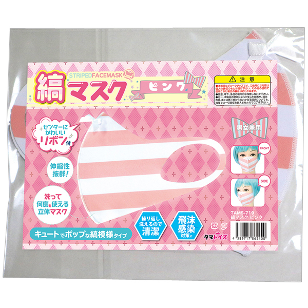 顔にピタッとフィットする伸縮性抜群の可愛い縞パン風立体マスク(ピンク)。 白×ピンクのキュートでポップなカラーリングが魅力!センターには小さな白リボンをあしらいアクセントをつけています。 洗って繰り返し使えるため衛生的で経済的♪コスプレ衣装やアニコス衣装と組み合わせて使えるラブリーな縞マスクです。 ウイルス対策、風邪予防、飛沫感染防止に◎●メーカー型番:TAMS-719 |