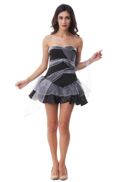 ゾンビメイクでミイラな花嫁に♪ハロウィンにぴったりなゾンビ系ウェディングドレスコスチューム。 ダークなブラックカラーのベアトップワンピースに巻いたオーガンジーリボンでミイラの包帯をイメージ!腕にぐるりと巻きつけられるよう、単品リボンもセット。 サテン素材のふんわりミニスカートで可愛らしさもしっかり備えたハロウィンコスプレ衣装です。 ※セット内容以外は付属しておりません。 |