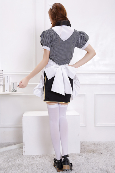 | ■仕様:Mサイズ(平置き):トップスB43cm・着丈51cm・肩幅43cm・袖丈19cm スカート丈52cm・W32〜38cm セット内容:トップス(サイドファスナー)、スカート(ウェストゴム入り・背面ファスナー、パニエ一体型)、エプロン、カチューシャ、ネクタイ(ゴムバンド仕様) |