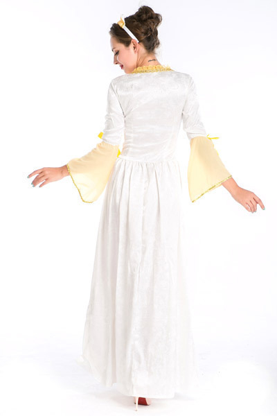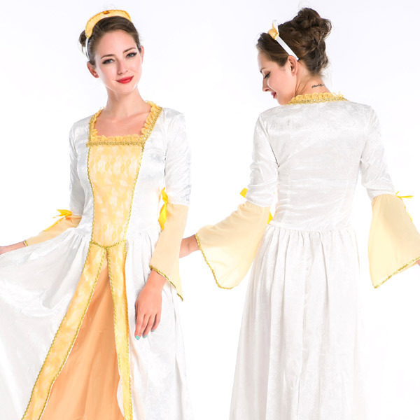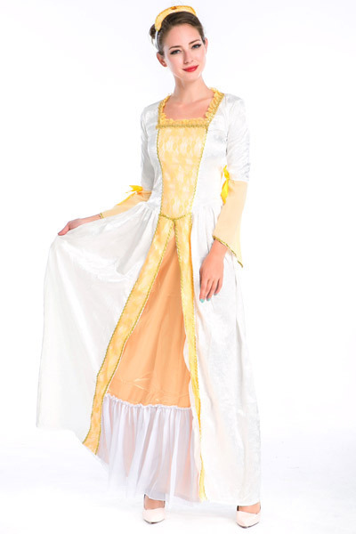 品のあるレースが優雅に舞うルネッサンス調のドレスコスチューム。 ホワイトカラーをベースにイエローカラーを組み合わせたふんわりと柔らかな印象のロングワンピースは、上品にフリルが囲うスクエアネックデザイン!スカート部分は重ね着風のレイヤードスタイルでゴージャスに!フレアなラッフルスリーブにはリボンを添えて可愛らしさもしっかり♪ビジュー付きのカチューシャもセットです。 ※セット内容以外は付属しておりません。 |