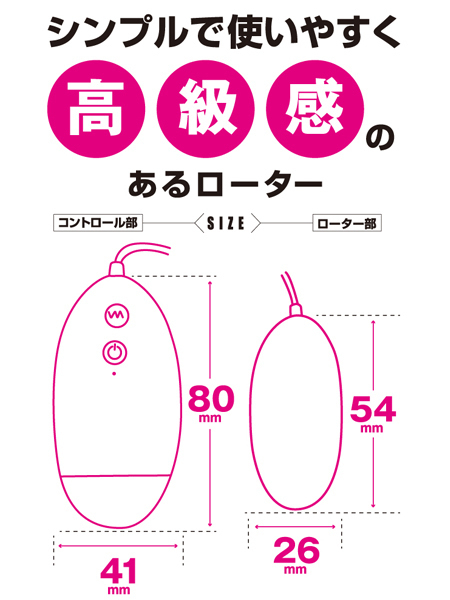 | ■仕様:パッケージ:16.5×9.0×5.0cm 本体:ローター5.4×2.6cm 重量:43g 電池:単四電池×2本使用 |