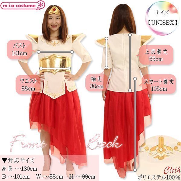 | ■仕様:男女兼用サイズ:身長〜180cm・B〜101cm・W〜88cm・H〜99cm・着丈(上衣63cm・スカート105cm)・袖丈30cm) セット内容:上衣(背中心ファスナー)、スカート(ウエストゴム)、ヘアバンド 素材:ポリエステル100% |