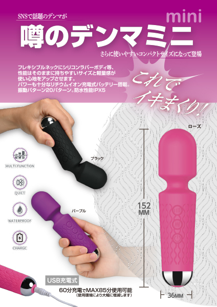 ネットや動画などで使われていてよく見る話題のデンマが、さらに使いやすいコンパクトサイズになって登場!フレキシブルネックにシリコンラバーボディ等、性能はそのままに、持ちやすいサイズと軽量感が使い心地をさらにアップさせました♪パワーも十分なリチウムイオン充電式バッテリーを搭載し、60分の充電で最大85分の使用が可能。 (使用環境により大幅に増減します)。 振動パターンは20パターンを搭載し、防水性能IPX5となっています♪3種類のカラーバリエーション展開でこちらはパープルとなっています。 |