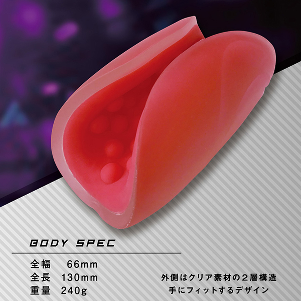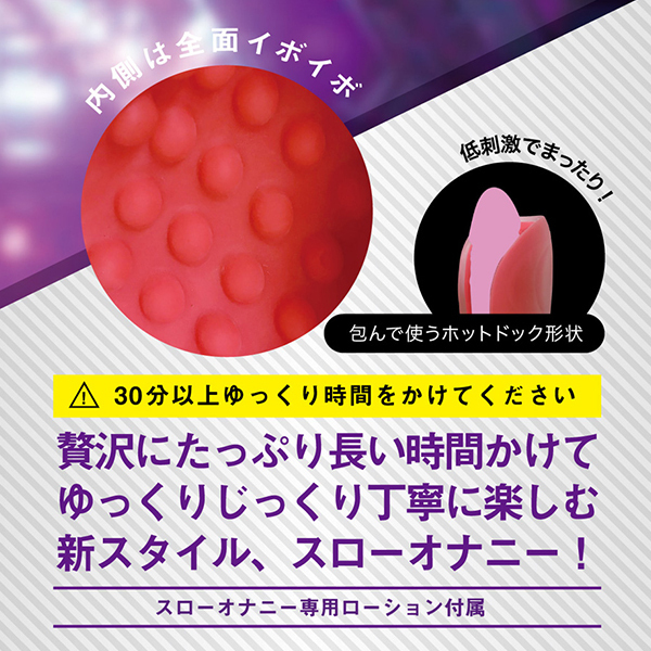 時間を掛けて限界を超える。 スローオナニー専用オナホール「ズリセン」!あなたは、「スローオナニー」という言葉を知っていますか?贅沢にたっぷり長い時間をかけて、ゆっくりじっくり丁寧にプレイを楽しむ、それがスローオナニー。 「ズリセン」は、そんな新しいプレイスタイルのために生まれたオナホールです。 挟み込むホットドッグ形状と、まったり刺激とで、スローオナニーをサポートします。 貴男をパックリと挟んで包むホットドッグのパンズような形状が特徴的です。 通常のオナホールにある挿入行為が不要で挟むんでコスるだけで楽しめるのでビンビン状態でなくても使用可能。 半ビン状態から優しいアプローチで、ゆっくりと気分を高めることが出来るのです。 長い時間を楽しめるよう、まったりとした刺激も特徴的。 最初は優しくスリスリ、盛り上がってきたら裏をズルズル、さらに高まってきたら頭をグリグリとまるで磨き上げるようにじっくり楽しめます。 焦らすようにジワジワと快感を貯め込むことでフィニッシュ快感は遥かな高みに到達するはず。 すぐにフィニッシュを求めず、そこに至るまでの刺激を楽しみ続け、より深い快感を目指す贅沢な流儀。 それが新しいスタイル、スローオナニーなのです。 強い刺激やビンビン持続も必要ないので、「早さ」や「タフさ」のトレーニングにも!?「イボ」は、大きなイボイボ突起がびっしり配置されたデコボコ快感。 弾力たっぷりな肉感素材。 クリアカラーに包まれたビビッドなレッドカラーが絶妙な高級感を演出。 手コキと相性ぴったりなツブツブのまったり刺激をお楽しみください。 |