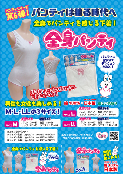 ついにパンティを着る時代が到来!優しい肌触りの綿生地が全身を包み込む男女兼用の日本製レオタード型パンティ。 股の部分には本格的なクロッチ付!リグレジャパンの匂いグッズ「聖の聖臭」シリーズと組み合わせてみても◎ |