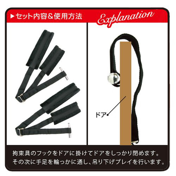 ドアの上部にフックを噛ませて腕と脚を固定!吊り下げ拘束が簡単にできるSMグッズ。 初心者でも本格プレイが楽しめる、イーロックシリーズのドア腕・両足拘束具です。 肌を痛めないようソフトな素材で作られ、体重の負荷を軽減させるため肉厚に仕立ててあり、縄で拘束するよりも負担が少ない簡易拘束具です。 ドアの耐久性と吊り下げる人の体重を考慮して、安全にご使用ください。 ※設置場所の状態を確認してからご使用ください。 |