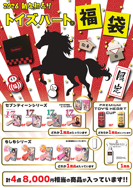 総額8000円相当!大人気のトイズハート製品をたっぷり詰め込んだ超豪華な福袋を、完全数量限定【2700円】で販売中です。 オナホール3点とローションが1点、どんな商品が届くかは開けてからのお楽しみ♪特製バッグに詰めてお届けします。 こちらは大サービス商品の為、ご注文はお一人様1袋限りとさせていただきます。 |