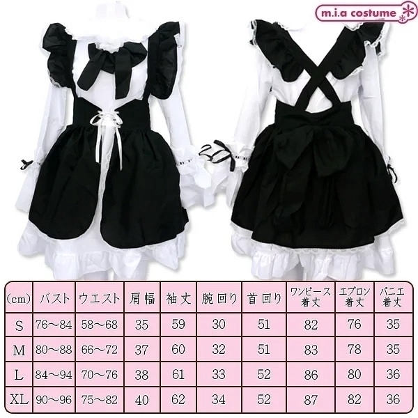 | ■仕様:Mサイズ:B80〜88cm・W66〜72cm・肩幅37cm・袖丈60cm・腕周り32cm・首周り51cm・着丈(ワンピース83cm、エプロン78cm、パニエ約35cm)・帽子頭周り55cm セット内容:胸リボン付きワンピース、編み上げリボン付きエプロン、パニエ、コサージュ、カチューシャ、帽子 |