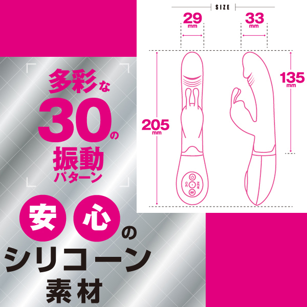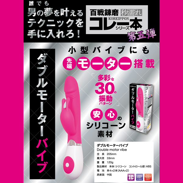 小型バイブにも先端モーターを搭載!クリトリスもしっかり刺激するダブルモーターを搭載した「ダブルモーターバイブ」。 大きすぎず小さすぎずなちょうど良いサイズ感で2点責めの王道タイプ!単四電池2本で駆動するバイブで30種類もの豊富なパターンで飽きずに振動刺激を体感できます♪挿入シャフトは先端が亀頭のような形状で素材にはシリコンを採用!挿入フィーリングも悪くなく、モーター内蔵の子機はウサ耳タイプとなっておりますのでクリへの刺激もダイレクトに楽しめます♪ |