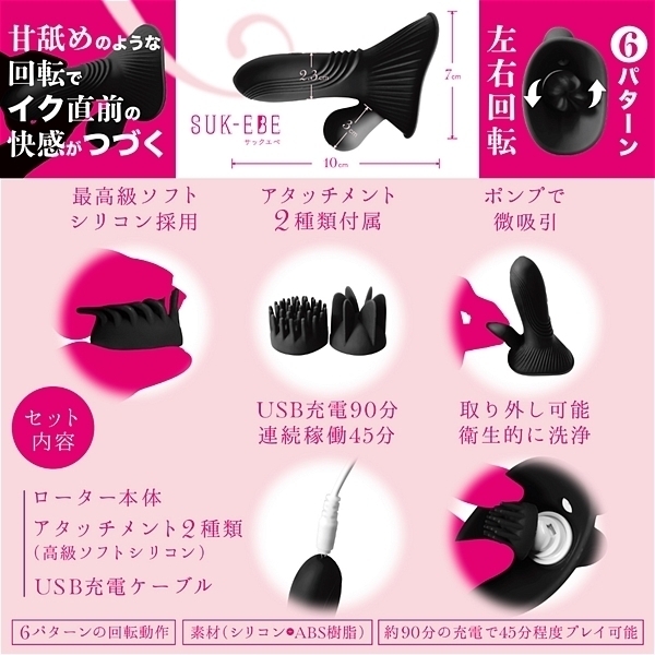 優しく舐めるから、イク直前の感覚がつづく。 それが「ヤバ回転ローターNEBURINGUS−ネブリングス−」です。 強い振動ばかりに慣れていると感度が鈍くなりませんか?今こそ優しくせつなく敏感な部分を「ねぶり」ましょう。 敏感なアソコも胸もどちらもOK!!最初に使うときはお好みのアタッチメントを装着してからご使用ください。 極限まで柔かくした高級シリコンブラシが優しく回転して刺激します。 (薄めのローションをつけると滑りが良くなります)焦らされるような独特の感覚が、オーガズム直前のもどかしさを再現。 左右回転6パターンで飽きさせません。 優しさを演出するために敢えて「微」吸引ポンプも設置。 ポンプのプッシュでもどかしい吸い付きが更なる焦らしを演出。 しかも交換用アタッチメントつきで楽しさ2倍。 【セット内容】ローター本体/アタッチメント(高級ソフトシリコン)/USB充電ケーブル。 滑らかな感触をお求めの場合はローションをご利用ください。 ・6パターンの回転動作・約90分の充電で45分程度楽しめます●タイプB |