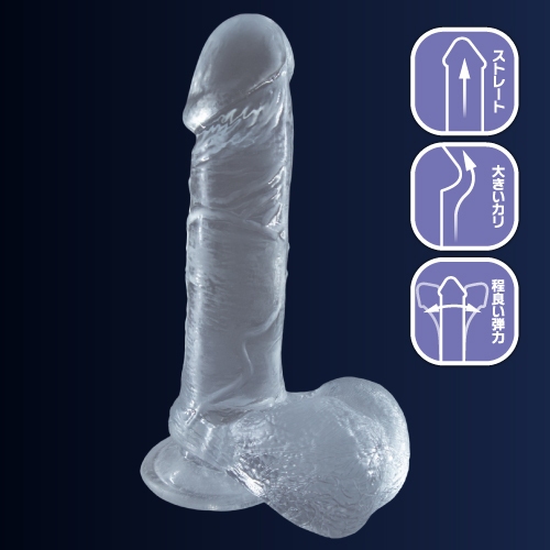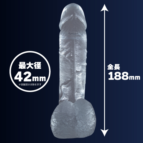 先っぽから根元までずっぽりと太く真っ直ぐ奥まで届く「クリアディルド(Lサイズ)」。 ストレート形状で大きなカリ、そして程よい弾力が特徴で、平均的な日本人サイズのペニスでは体験できない快感が味わえるのが自慢です♪太く、まっすぐ向き合う太い俺!透明ディルドで吸盤付きで、挿入感がたまらないので太さと大きさを求めている方におすすめです♪ |